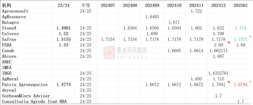 当前不同咨询机构对2024/2025季巴西大豆产量的预估区间主要维持在1.67亿吨至1.74亿吨。巴西大豆产量预估存在分歧,Pátria AgroNegócios将其预估从12月份的1.7041亿吨下调到1.6794亿吨,下调幅度250万吨,主要是由于巴西南部和阿根廷产区近期少雨天气的影响。但也不乏部分机构上调产量,主要原因是巴西中西部大部分区域大豆长势良好,冲抵了一些南部天气的影响。